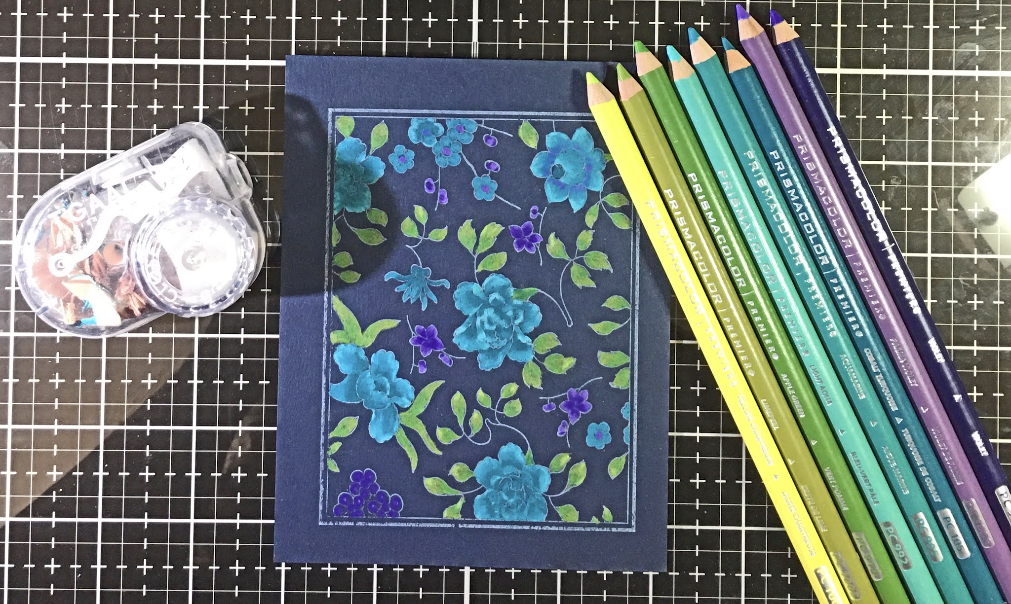 This is how the panel that I colored with pencils looked after I put it back into my stamp platform and stamped over the coloring with Versamark ink. I embossed this one with JudiKins Silver Detail embossing powder. The card at the very top of this post was taken in brighter light and shows off the colors better.
